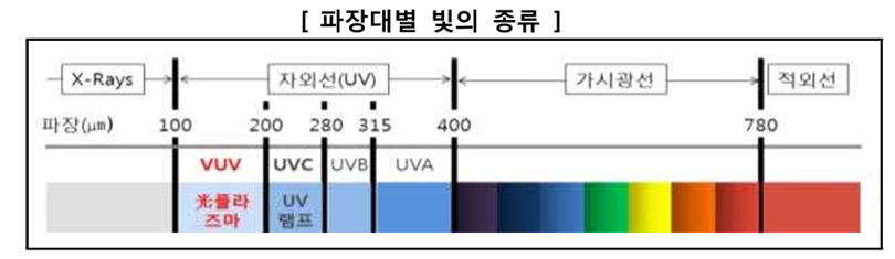 자외선 (UV) | 10 ~ 400 nm | 보이지 않음 | 살균, 피부에 영향 | 자외선 소독기, 피부검사 |